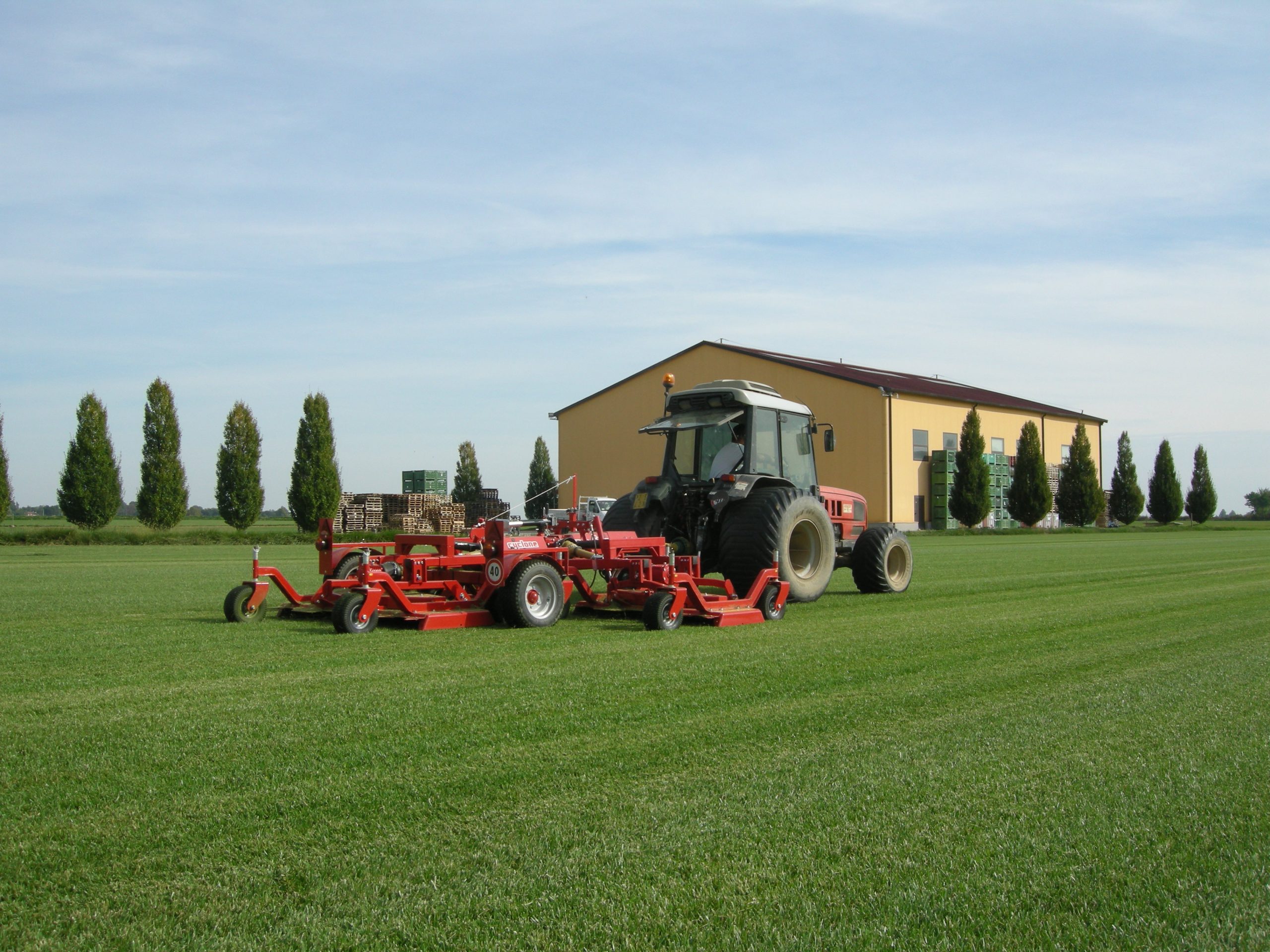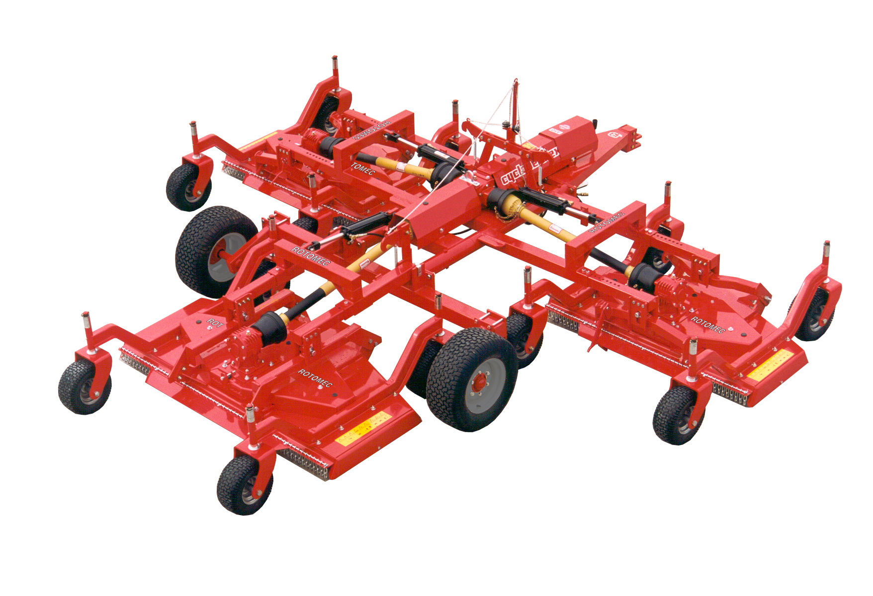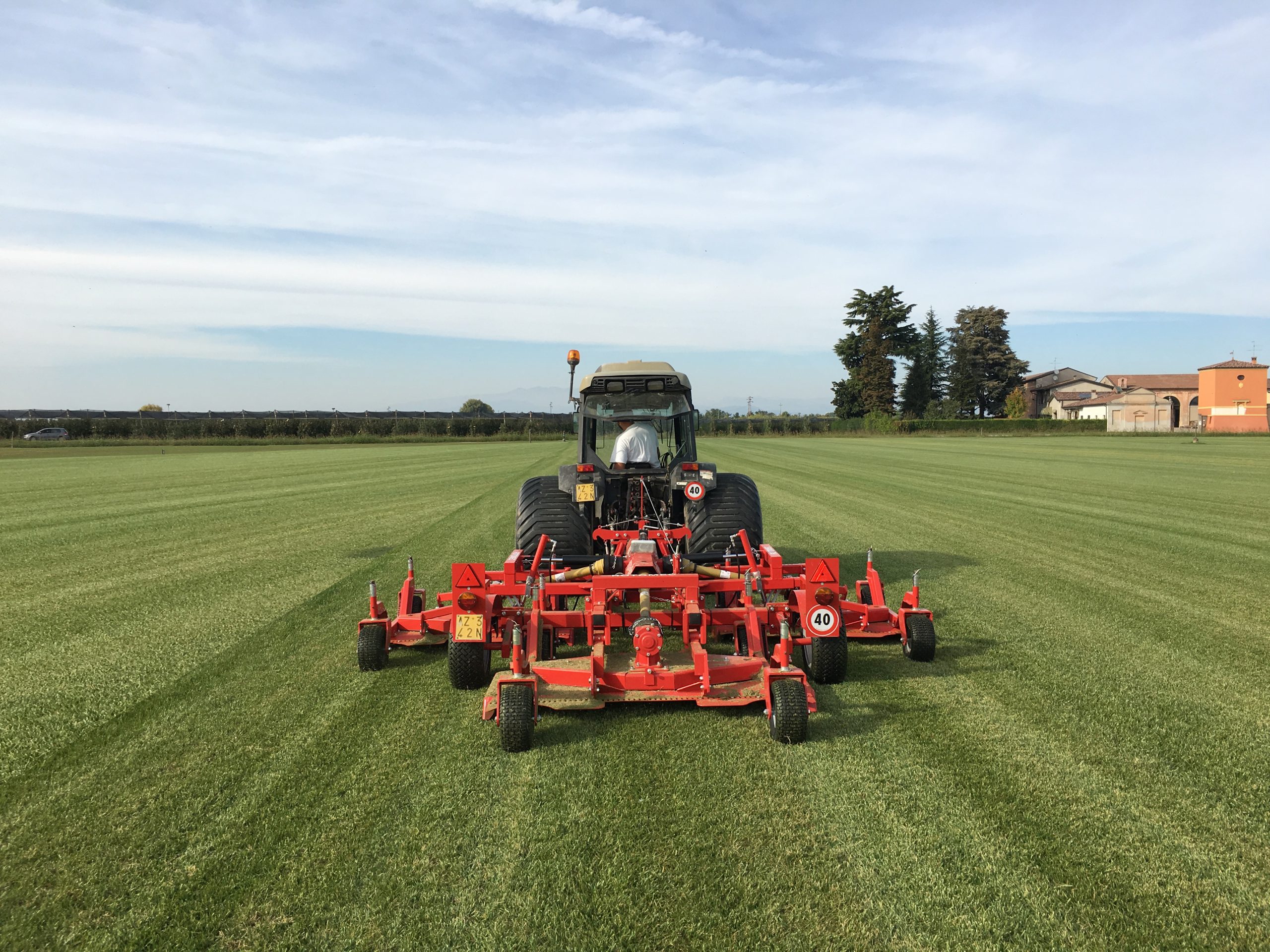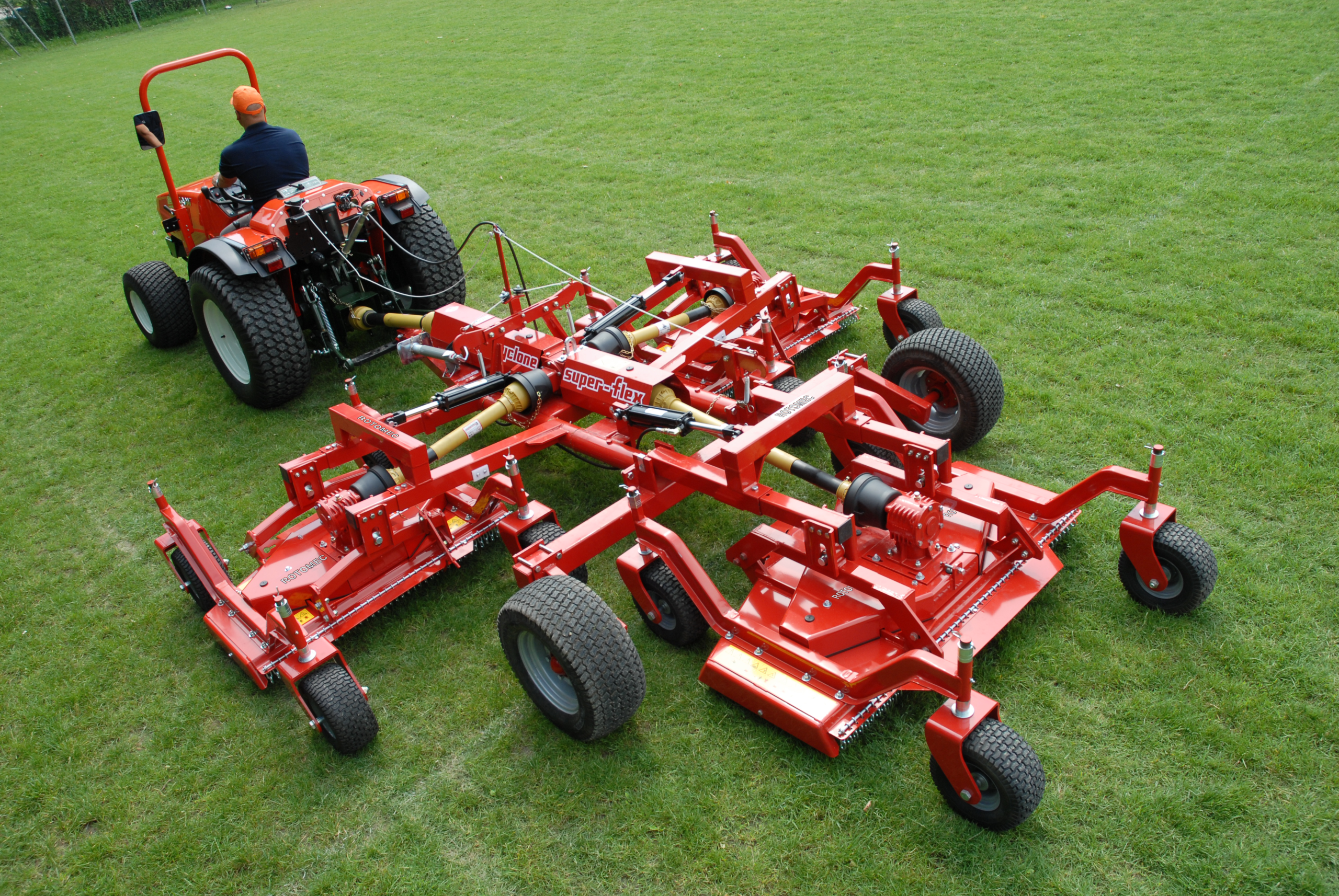 The Super-Flex gang grooming mower represents the most advanced proposal to reduce fuel costs without reducing the quality of work. The high cutting speed (12 – 15 km/h) along with the wide working widths allow to save money and time when mowing large patches of grass such as sports grounds, public parks, golf courses or sod farms. The Super-Flex differs from the Flex model mainly for its larger transport frame (including the large transport tires 585x267x305 mm) which make it more suitable to be towed over long distances, for the large 330 mm pneumatic tires mounted on the mowers helping it to distribute the weight of the unit on the ground, as well as for the larger 600 cm size available only in the Super-Flex version.
