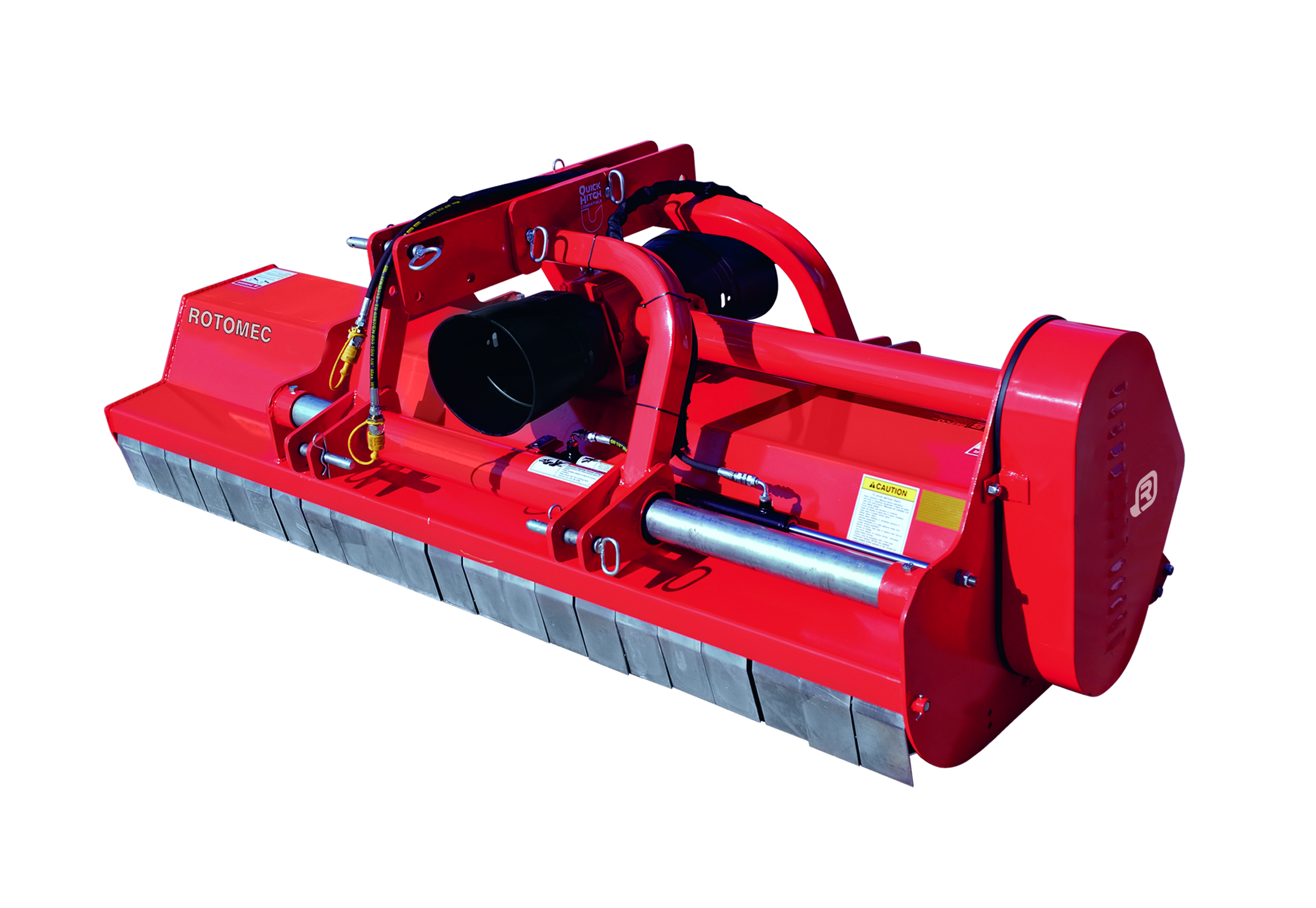 The Destroyer D90 is a sturdy, professional and easy to use shredder engineered for tractors from 40 to 90 HP with category 1 and 2 three point hitch. It is especially designed to offer the best performance in cutting and pulverizing corn stalks and other row crops, heavy grass from set-aside fields, tree prunings in orchards, municipal mowing and wherever professional, accurate and safe shredding are required. It is available in 3 working widths of 150, 180 and 220 cm. The unit is equipped with a belt driven transmission with 4 XPBX type belts and a manual belt tensioner. The rotor has a diameter of 133 mm and carries heavy hammer type blades capable of cutting stalks up to 5 cm of diameter. The D90 comes standard with a hydraulic cylinder that allows the operator to offset the shredder up to 40 cm to the right (30 cm on the 150 cm wide model). The cutting height can vary from a minimum of 2 cm to a maximum of 13 cm and is adjusted through the rear roller which is also equipped with a roller scraper. The driveline is equipped with an overrunning clutch.