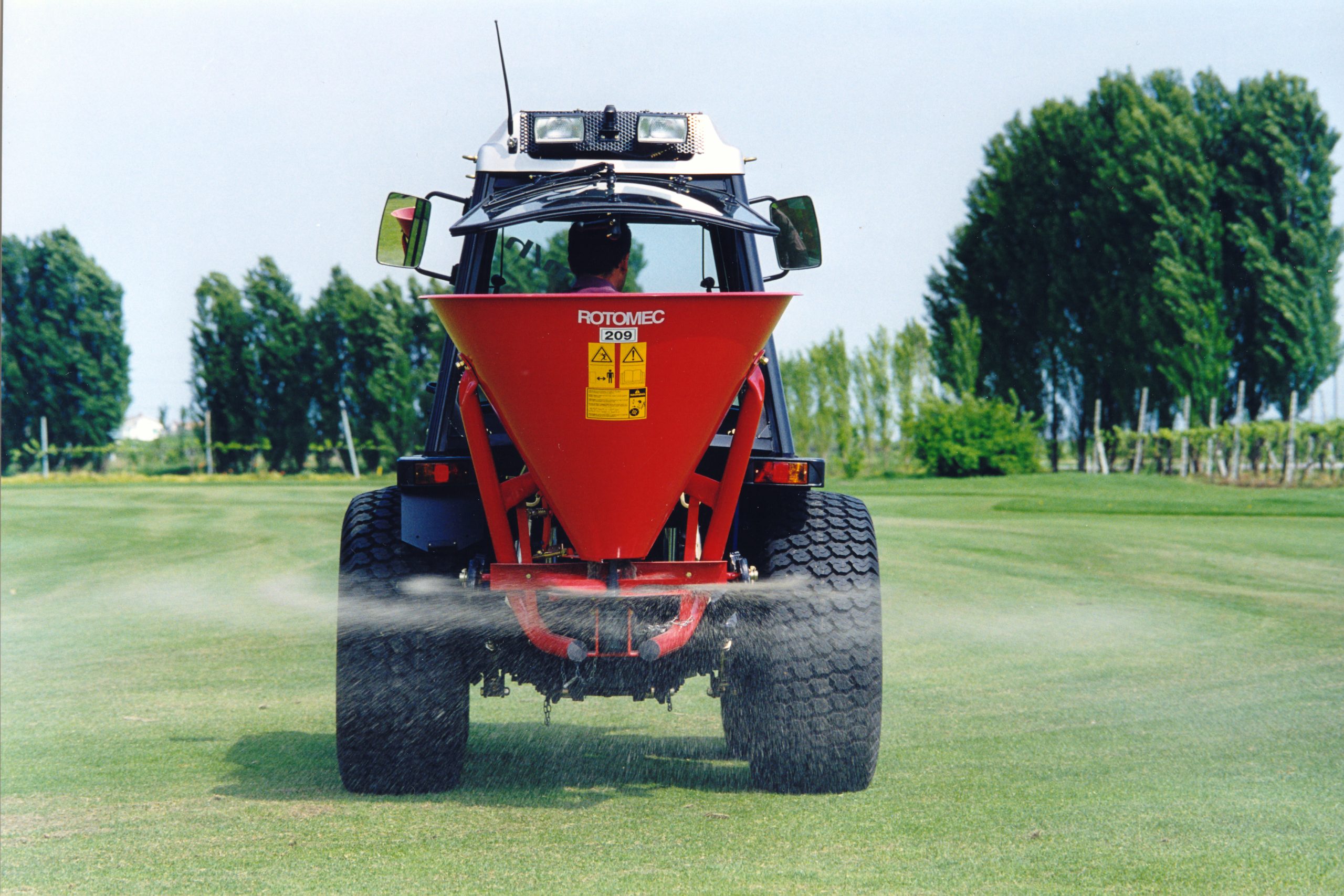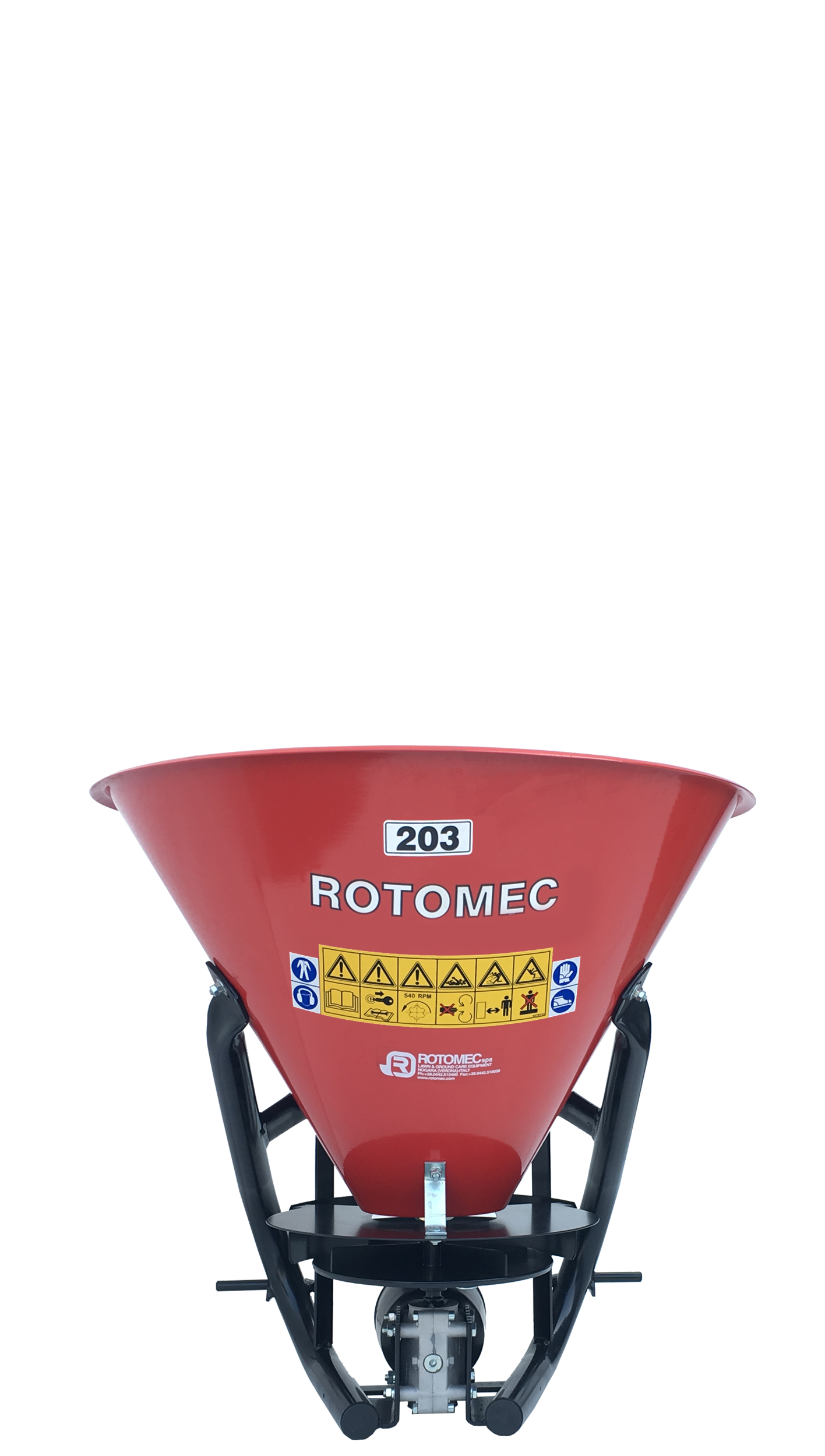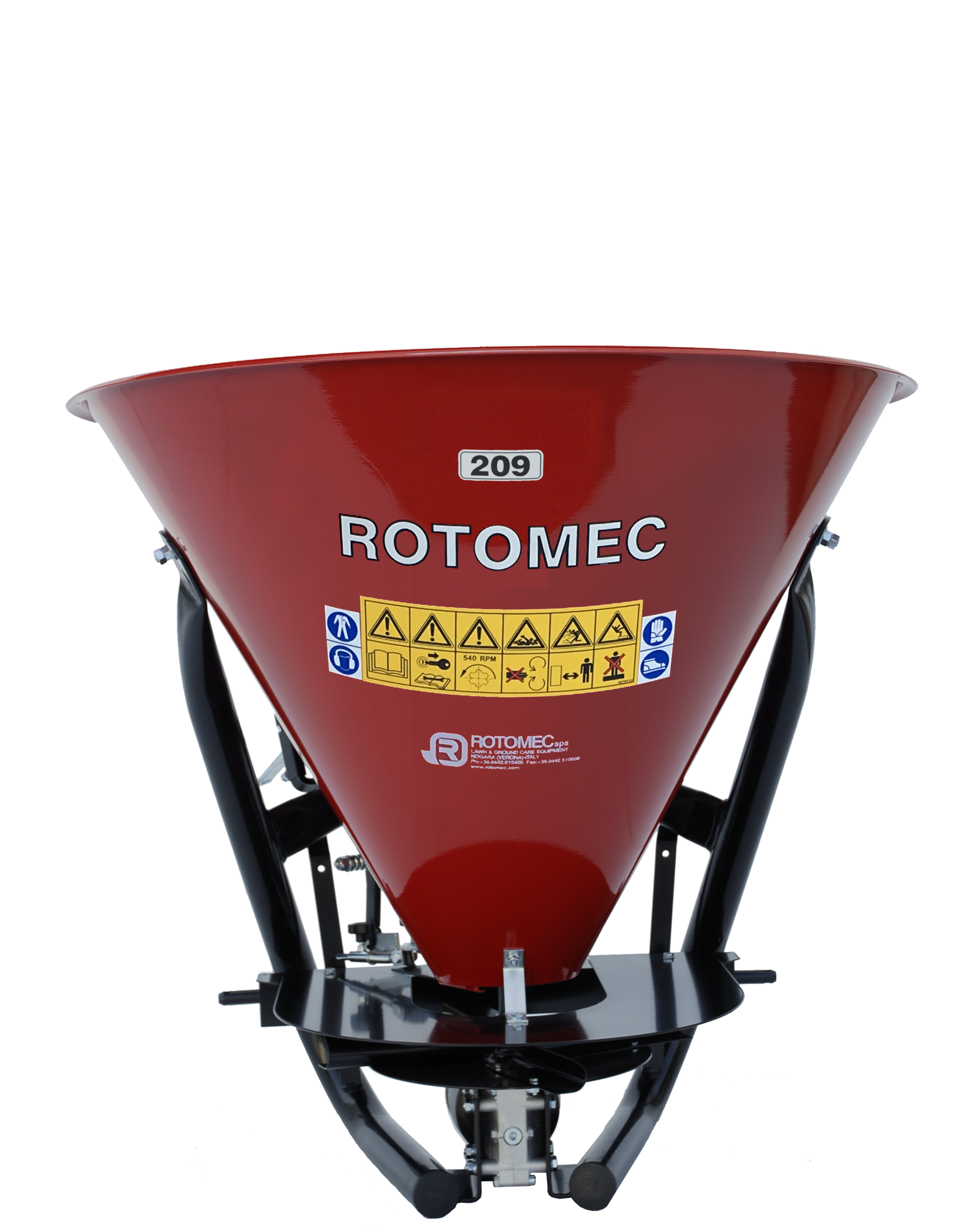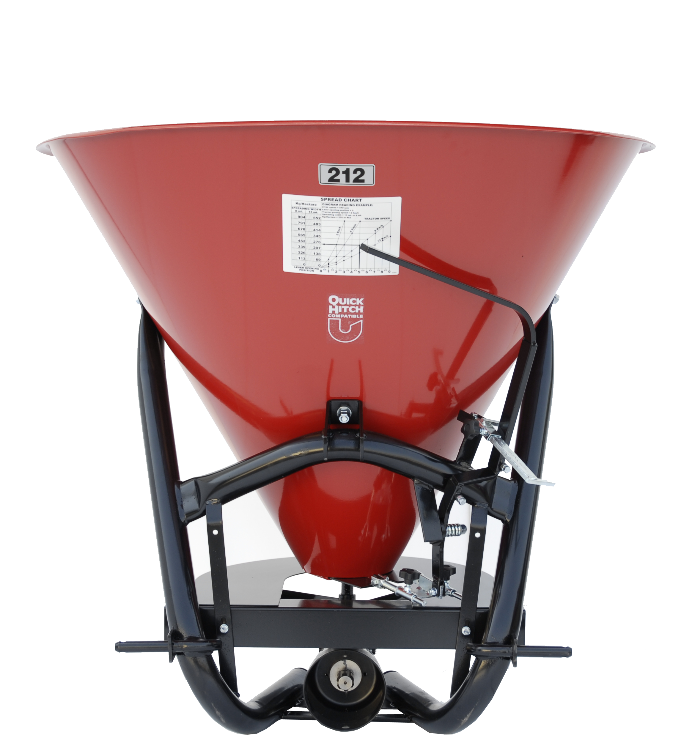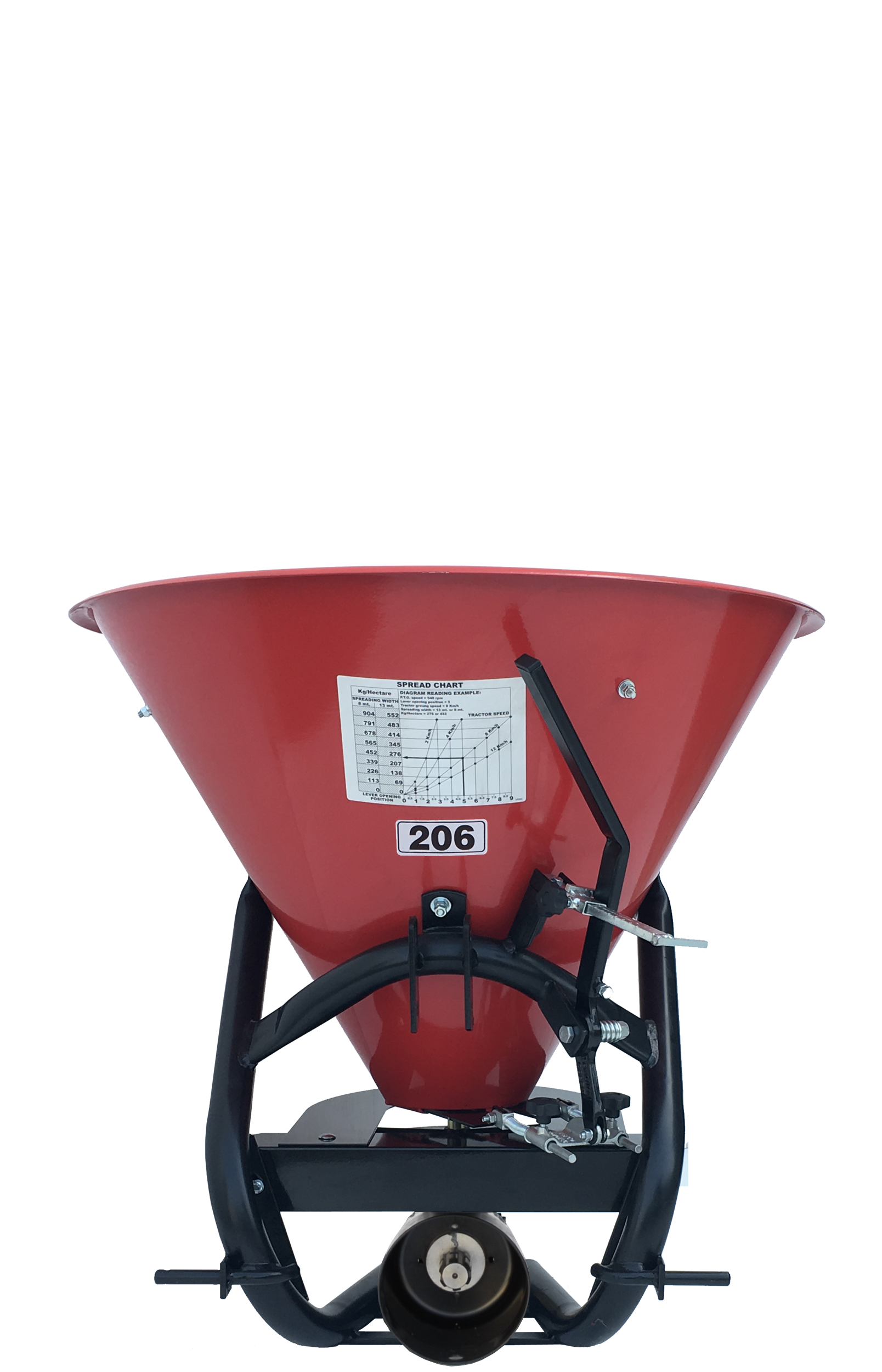 The Hop fertilizer spreader, with a conic hopper and a distribution disc, is an easy and economical tool for spreading granular and powdered fertilizers. It also serves as a salt or sand spreader. It is available in four sizes with hopper capacity of 105, 150, 250 and 350 liters. Hop fertilizer spreaders are designed for tractors ranging from 16 to 50 HP at 540 rpm. They are equipped standard with a fixed agitator or are available with a wheel agitator upon request.